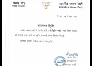 बीजेपी के राष्ट्रीय महासचिव की ओर से जारी आधिकारिक पत्र में कहा गया है कि भारतीय जनता पार्टी के संसदीय बोर्ड ने नितिन नबीन की नियुक्ति को मंजूरी दी है। पत्र के अनुसार, उनकी यह नियुक्ति तत्काल प्रभाव से लागू हो गई है।