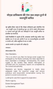 सोसायटी मैनेजमेंट टीम की ओर से जारी सूचना में बताया गया कि नोएडा प्राधिकरण द्वारा संचालित गंगा जल आपूर्ति लाइन में खराबी या टूट-फूट आने के कारण यह समस्या उत्पन्न हुई है। मरम्मत कार्य पूरा होने तक जल आपूर्ति बाधित रहने की संभावना जताई गई। मैनेजमेंट ने निवासियों से अपील की कि वे आवश्यक उपयोग के लिए पानी का सीमित और सावधानीपूर्वक इस्तेमाल करें, ताकि स्थिति सामान्य होने तक असुविधा को कम किया जा सके।
